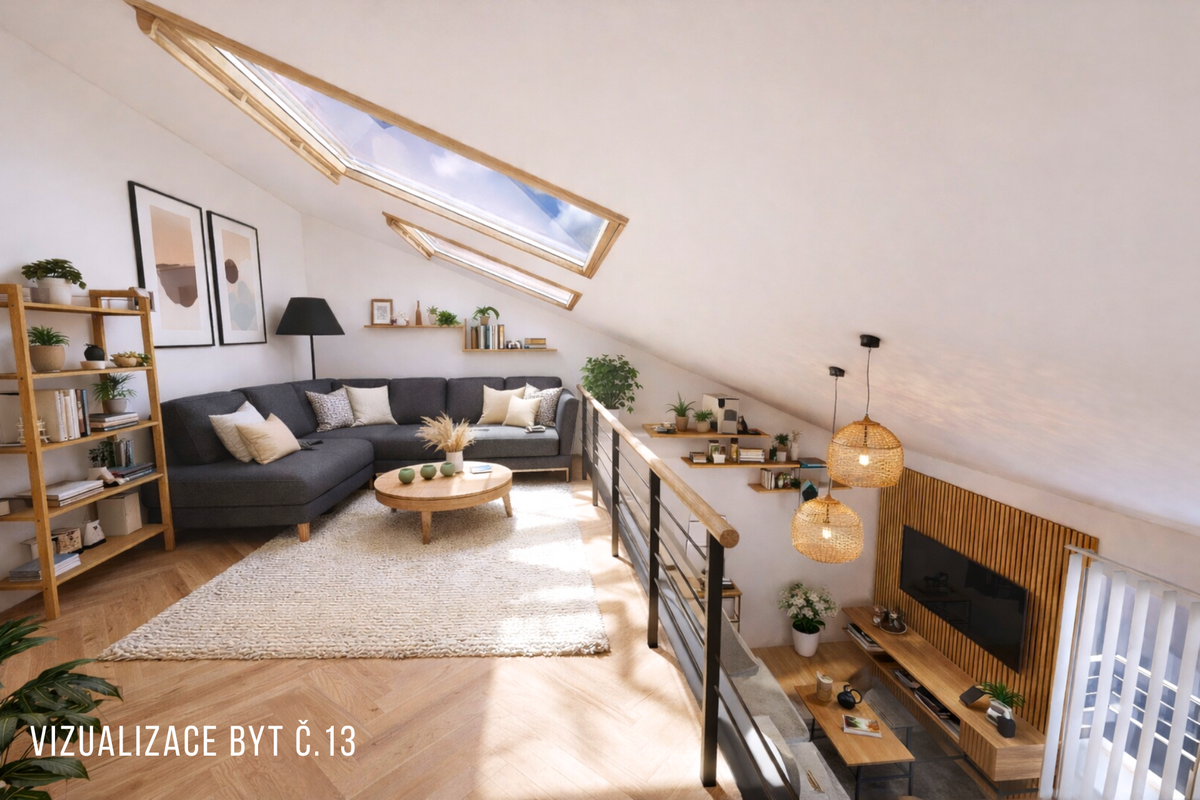 Velkým benefitem a zajímavostí tohoto bytu je světlé podkroví/loft s klimatizací – skvělé jako pracovna, nebo dětský koutek.